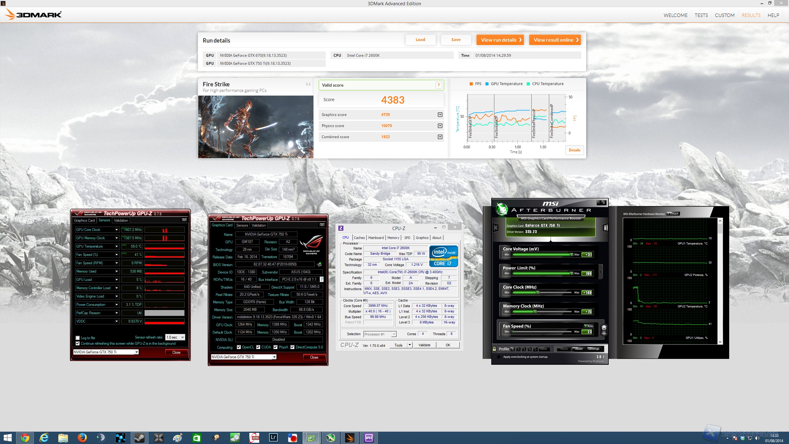 Andiamo ora a vedere come si comporta questa scheda in overclock. L’overclock, per chi non lo sapesse, consiste nel perseguire il miglioramento delle prestazioni di un componente elettronico di un elaboratore (in genere una CPU) mediante l'aumento della frequenza di clock rispetto a quella prevista dal produttore. Ricordiamo che la scheda oggetto della recensione odierna presenta un overclock di fabbrica di +117 MHz in boost clock e +104 MHz in base clock per quanto riguarda il core mentre le memorie non hanno subito nessun overclock di fabbrica. Vi ricordiamo brevemente le frequenze stock della scheda oggetto della recensione odierna: 1124 MHz base clock, 1202 MHz boost clock per il core e 1350 MHz (5400 MHz effettivi) per le memorie. Da queste frequenze, aumentando il voltaggio di +31 e alzando il Power Limit fino al valore 100, siamo riusciti a raggiungere i 1342 MHz sul core in boost clock e 1388 MHz (5552 MHz effettivi) per le memorie, toccando punte sul core di 1407 MHz in Kepler boost. Con queste frequenze abbiamo chiuso il 3DMark 2013 ottenendo i seguenti risultati: